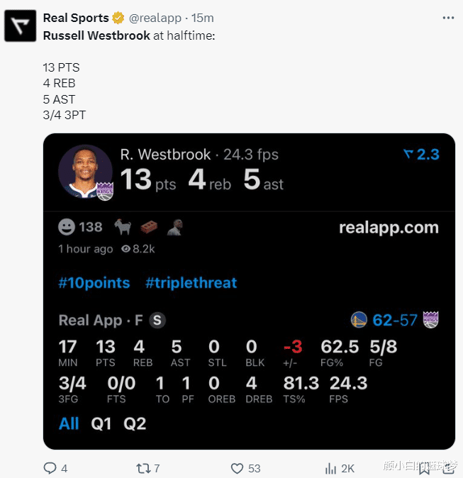 In the third quarter, Westbrook was still outstanding. He scored 6 points, 6 rebounds and 3 assists in 2 of 2 + 2 of 2 free throws in a single quarter. After three quarters, he scored 19 points, 10 rebounds and 8 assists, and shot 70% from the field. Is his first Kings triple-double coming?