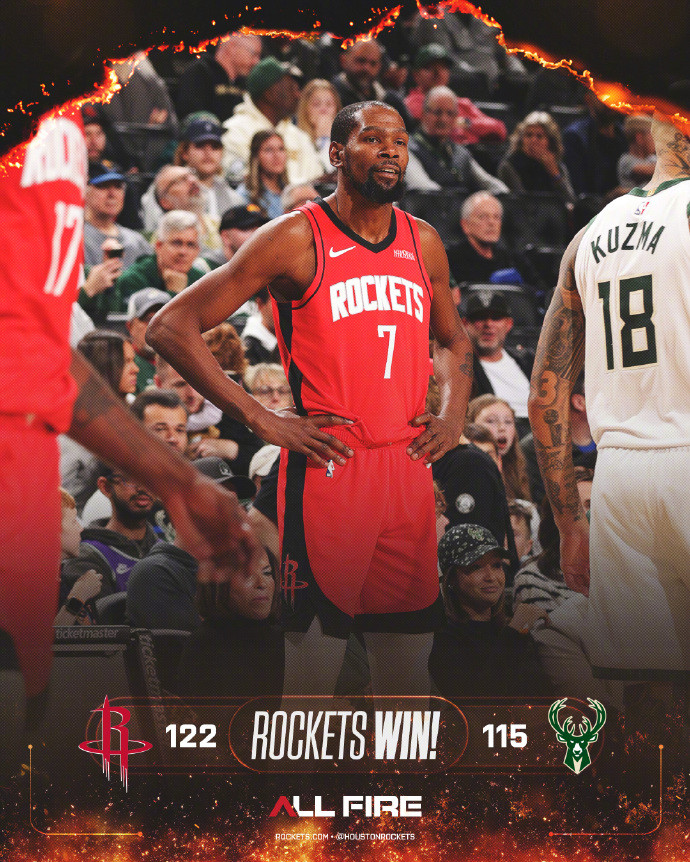 After losing to the Spurs in their last game and ending their 5-game winning streak, the Rockets reversed course and defeated the Bucks 122-115 on the road today, avoiding a losing streak. Their record came to 6 wins and 3 losses, ranking fifth in the Western Conference. With 5 minutes left in the game, the Rockets were still 8 points behind, but finally made a 22-7 spurt to overtake the score and win. The Rockets had the upper hand in rebounding today, grabbing a total of 50 rebounds, including 20 offensive rebounds, a season high. The Bucks only had 27 rebounds in total, including only 7 offensive rebounds.