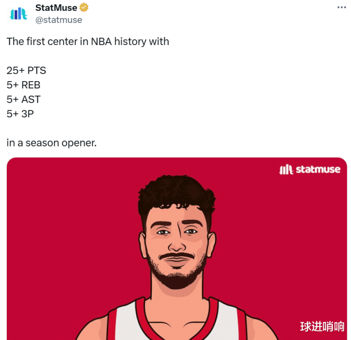 With this performance, Shen Jing became the first center in NBA history to score at least 25 points, 5 rebounds, and 5 assists in the opening game and hit 5 three-pointers. He was also the first player in Rockets history to score at least 39 points, 11 rebounds, and 7 assists in the opening game.