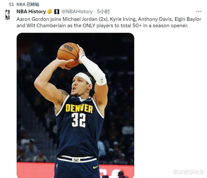 In NBA history, only 6 players can score 50+ points in the regular season opener: Chamberlain, Baylor, Jordan (2 times), Thomas, Irving and Aaron Gordon. Although Alexander scored 55 points in a single game, it was not the team's opening game, but the second round of the regular season. So, only Aaron Gordon has done it this season!