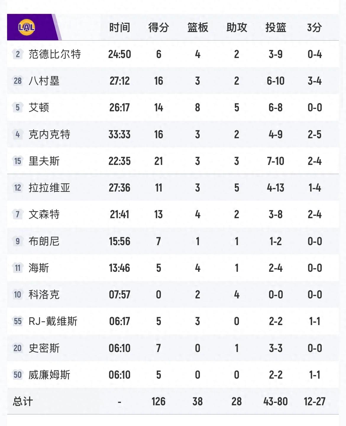 On the morning of October 13, the Lakers defeated the Warriors 126:116 in the NBA preseason game. The specific technical statistics are as follows: