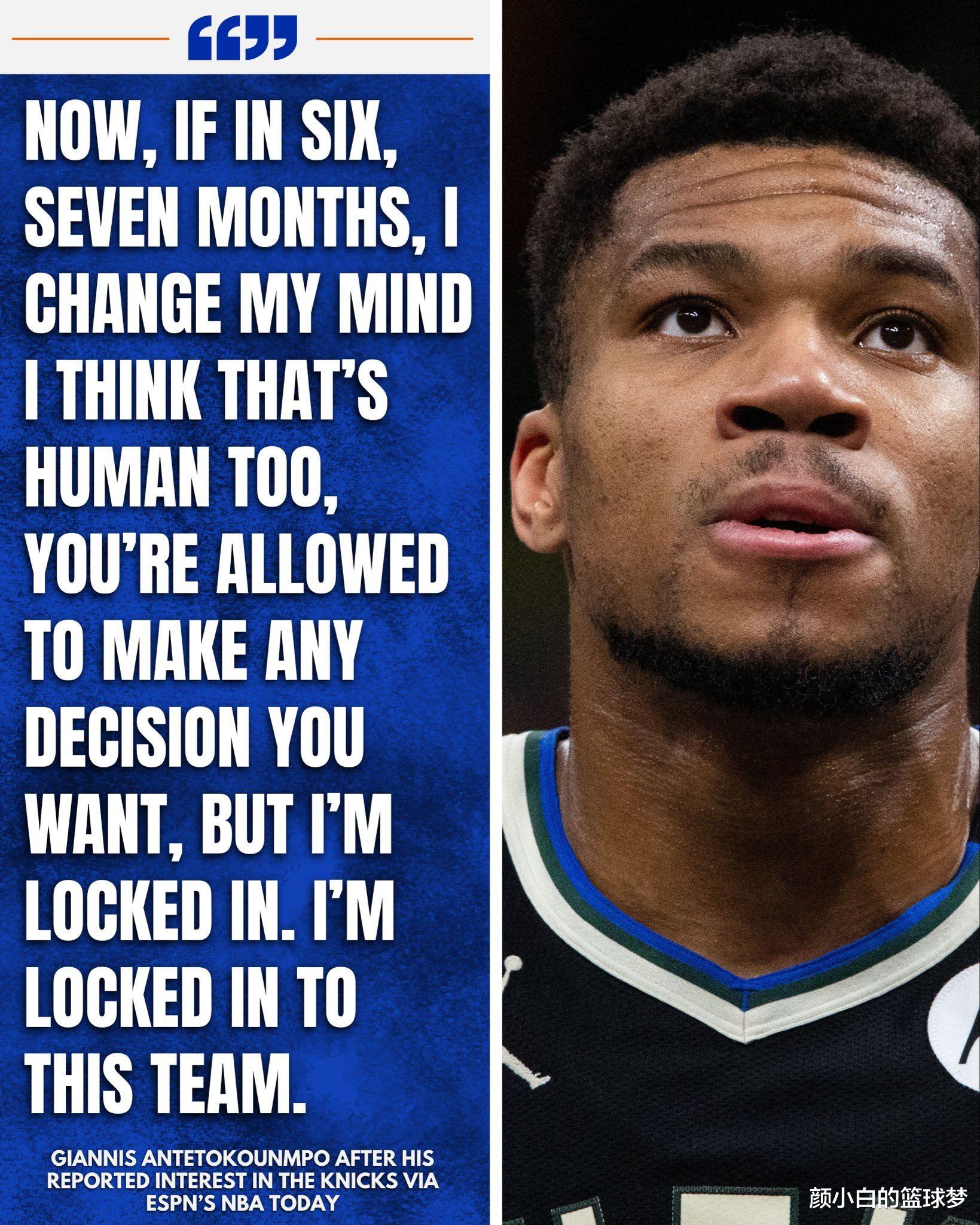 Then Antetokounmpo changed the topic: Of course, if I change my mind after 6-7 months, I think this is human nature, because I have the right to do what I think is right, but now I am focusing on the Bucks and dedicating myself to the Bucks team.