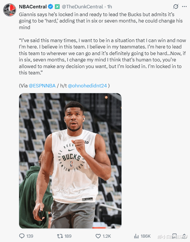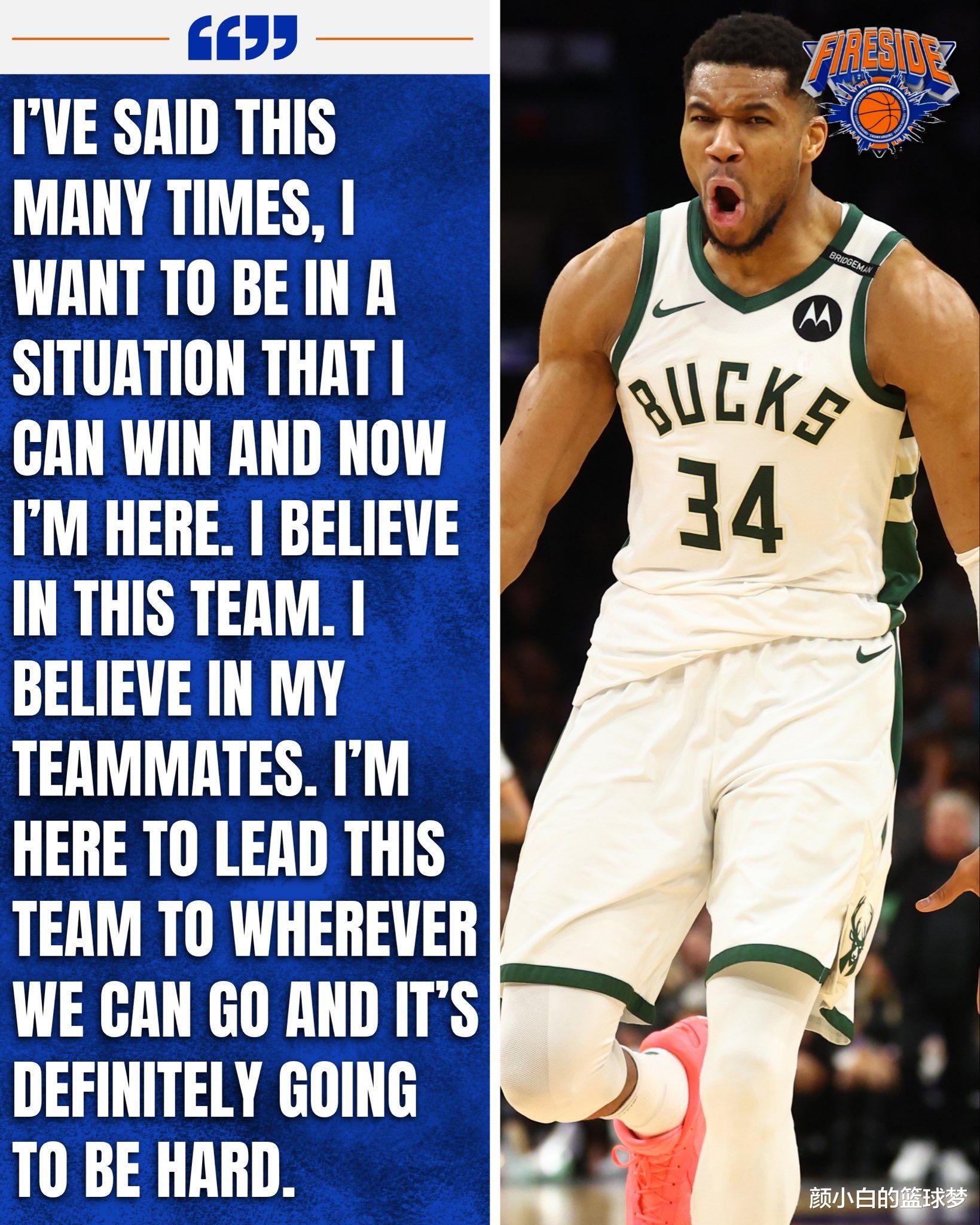 Giannis' detailed remarks are: I have talked about the topic of trade rumors many times. I hope that I am in a team that can compete for the championship. Now that I am playing in the Bucks, I believe in our team and teammates. I will lead this team to the championship, although it is difficult.