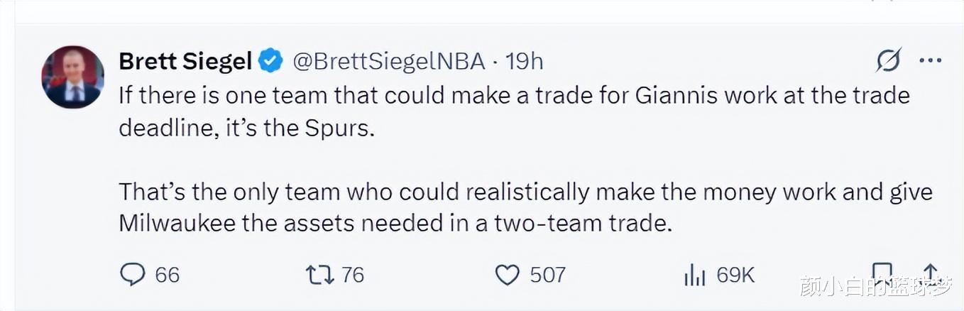 According to American reporter Brett Siegel, if there is a team that can afford Giannis’ trading assets this season, it is the Spurs. The Spurs are the only team that can meet the requirements of the Bucks. (Because Thunder reporters have made it clear before that they have no interest in Giannis despite holding multiple first-round picks.)