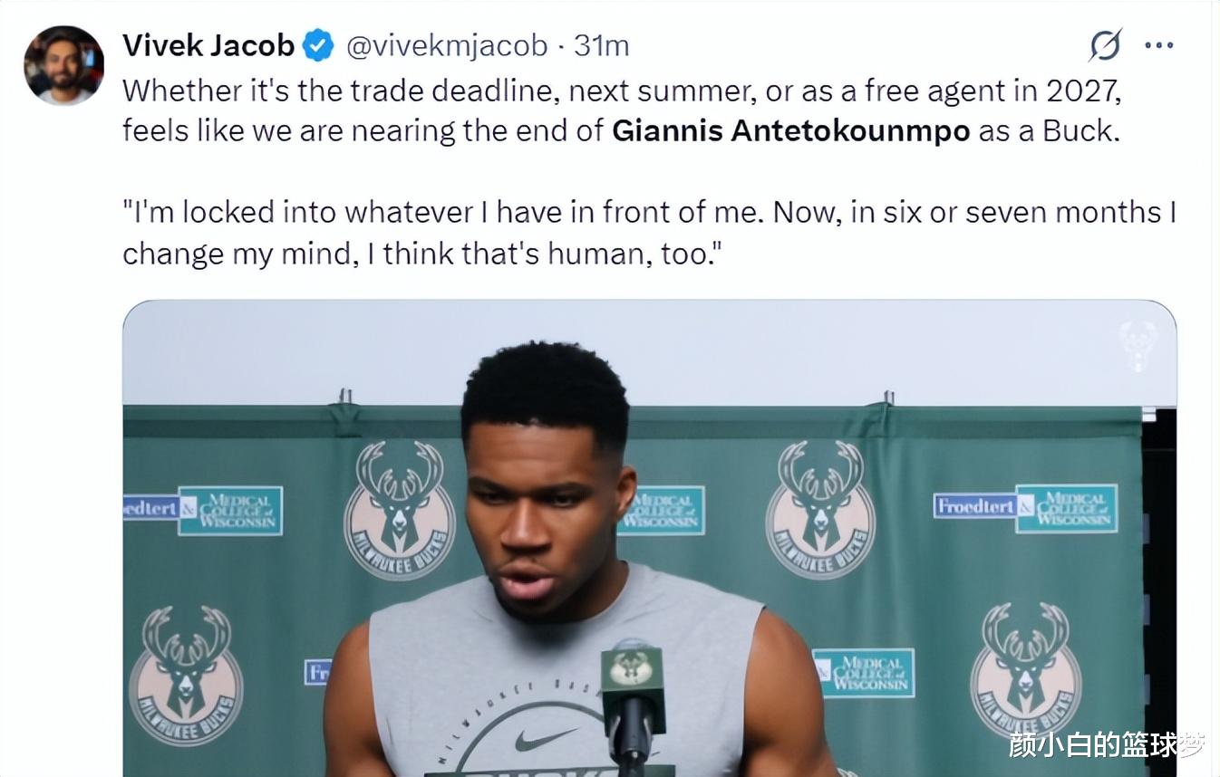 US reporter Vivek Jacob wrote: Judging from Giannis’ remarks, his career as a Bucks player is entering a countdown. Whether it is the trade deadline, next summer or the summer of 2027, in short, he will leave Milwaukee.