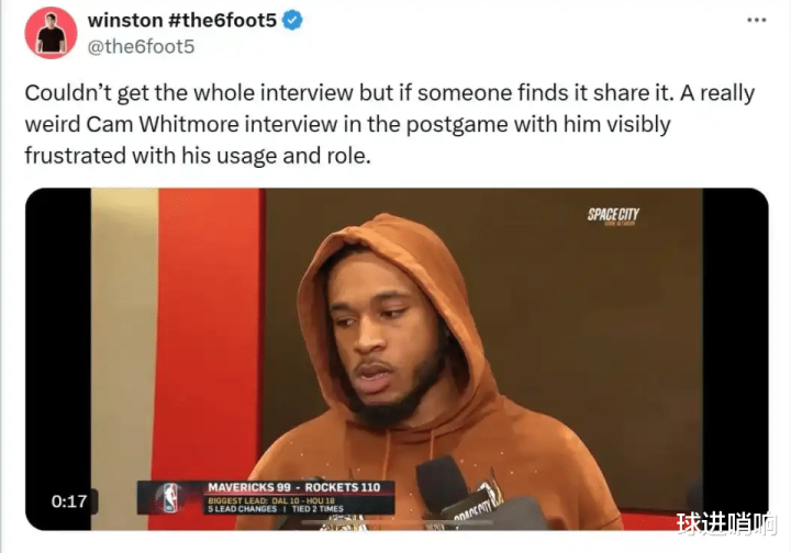 As a result, when the Rockets finally completed their reconstruction process after several years, Whitmore not only remained stagnant, but also repeatedly got angry with the coaching staff over issues such as playing time and role positioning.