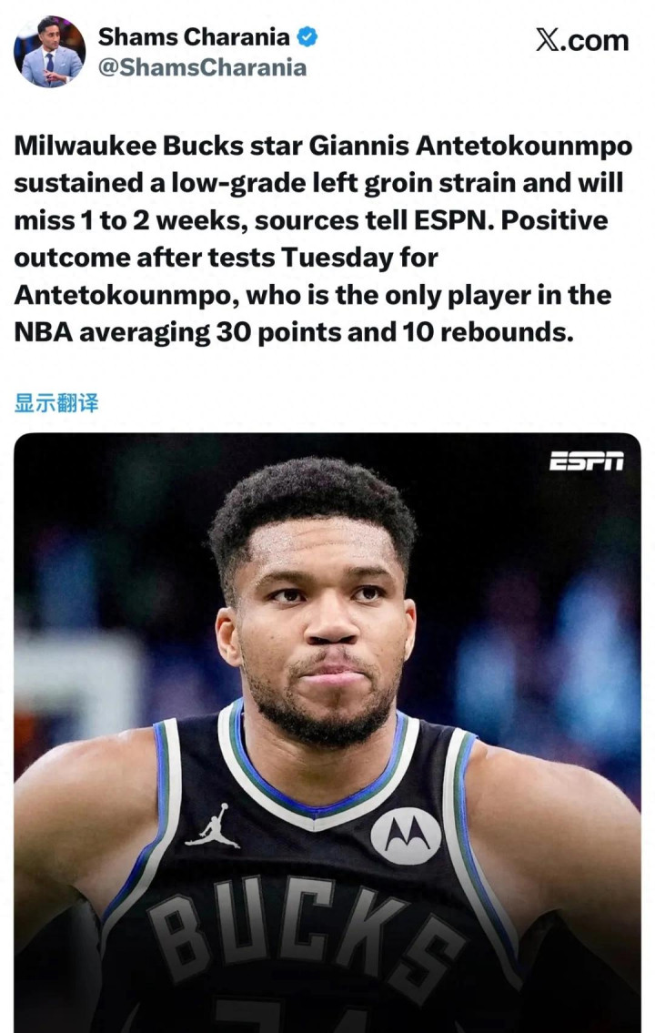 BasketballThe current offensive and defensive rhythm in the NBA is so fast that even a Greek monster cannot withstand it. Antetokounmpo suffered a slight strain on his left groin and will be absent for one to two weeks. So far this season, Antetokounmpo has p...