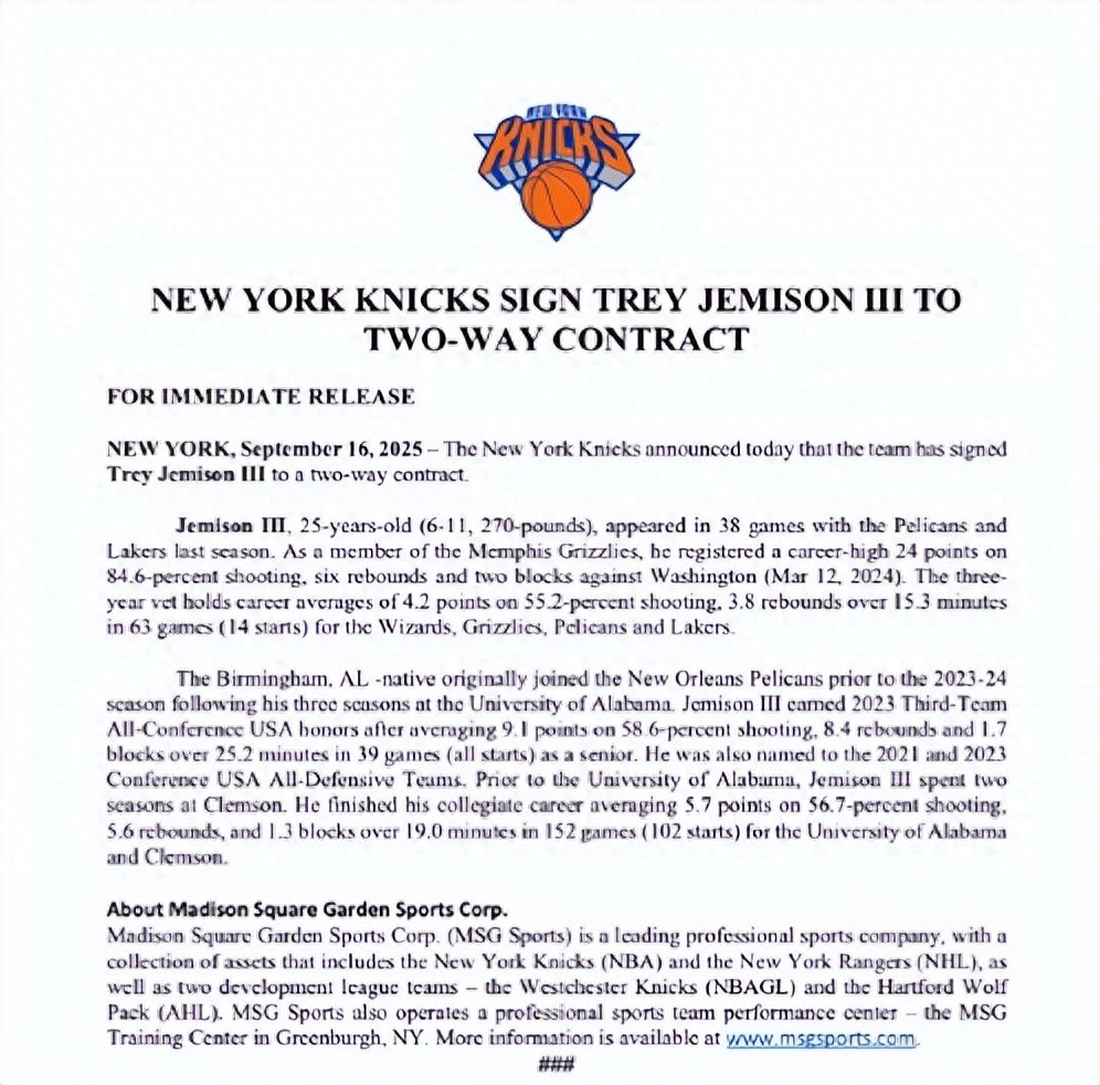 Now the Eastern Conference has continuously signed up, and both Lakers centers have successfully found jobs. Alex Ryan signed a training camp contract with the Knicks, but it was not guaranteed, so it was very difficult to stay in the team. As for Trey Jamison, because he has been in the league for a short time, he signed a two-way contract with the Knicks, which makes it easier for him to stay in the team.