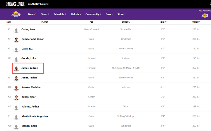 Currently, the official website of the South Bay Lakers shows that LeBron James has appeared on the South Bay Lakers roster.