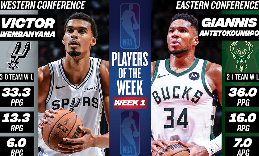 The NBA officially announced the Eastern and Western Players of the Week for the first week. In the East, Bucks forward Giannis Antetokounmpo was elected, and in the West, Spurs center Giannis Banyama was elected. Antetokounmpo averaged 36 points, 16 rebounds, 7 assists and 1 block last week, leading the Bucks to a record of 2 wins and 1 loss. According to statistics, Antetokounmpo is the first player in NBA history to score at least 100 points, 40 rebounds, and 15 assists in the first three games of the season. At the same time, this is the 28th time in Antetokounmpo's career that he has won the Best of the Week, ranking first in team history. Bunyama averaged 33.3 points + 13.3 rebounds + 2.3 assists + 1.7 steals + 6 blocks per game last week, leading the Spurs to a record of 3 wins and 0 losses. According to statistics, Bunyama is the first player in NBA history to score at least 100 points, 40 rebounds, and 15 blocks in the first three games of a season. At the same time, this is the second time in Bunyama's career that he has won the Player of the Week award. It is worth mentioning that Curry, Doncic, Reeves, Alexander, Sanqiu, Brunson, Xiao Ai, Maxey, Mitchell, Powell and others were nominated for the best of the week.