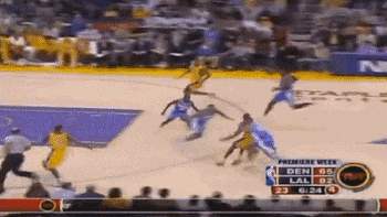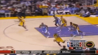 A counterattack by the Lakers turned into a counterattack by the Nuggets. After Anthony Carter got the ball, he threw it to Andre Miller in the frontcourt. Miller was going 1-on-0 for a layup, but he was blocked, and it was Kobe who caught him!
