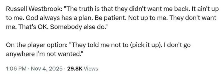 As mentioned above, Westbrook has shown a certain value this season. If he is waived and becomes a free agent, there is a high probability that a new owner will be willing to take him under his wing, or even choose to join a team of his choice. If he is traded, he has to pray that he can be sent to a competitive team; if he is traded to an equally bad team, he can also negotiate a buyout and enter the free market.