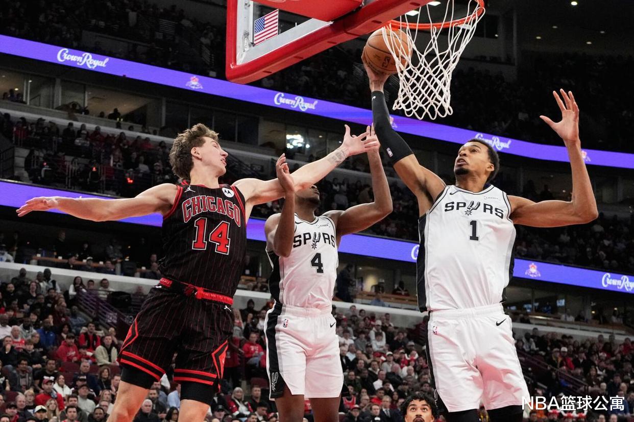 In the final decisive battle, Buzelis made a long shot, and Cornet missed two free throws. The Spurs grabbed consecutive offensive rebounds, and Cornet completed a strong put-back dunk. Cornette blocked Okoro, Huerter scored a three-pointer, and the Bulls took a 13-point lead. Wenbanyama scored from the outside, then stormed to the basket to tie 2+1, and Chicago requested a timeout. Wenbanyama scored on a single jump shot, and then scored in the mid-range shot. The Spurs launched a 12-6 offensive, with a point difference of only 3 points. The Bulls continued to request a timeout.