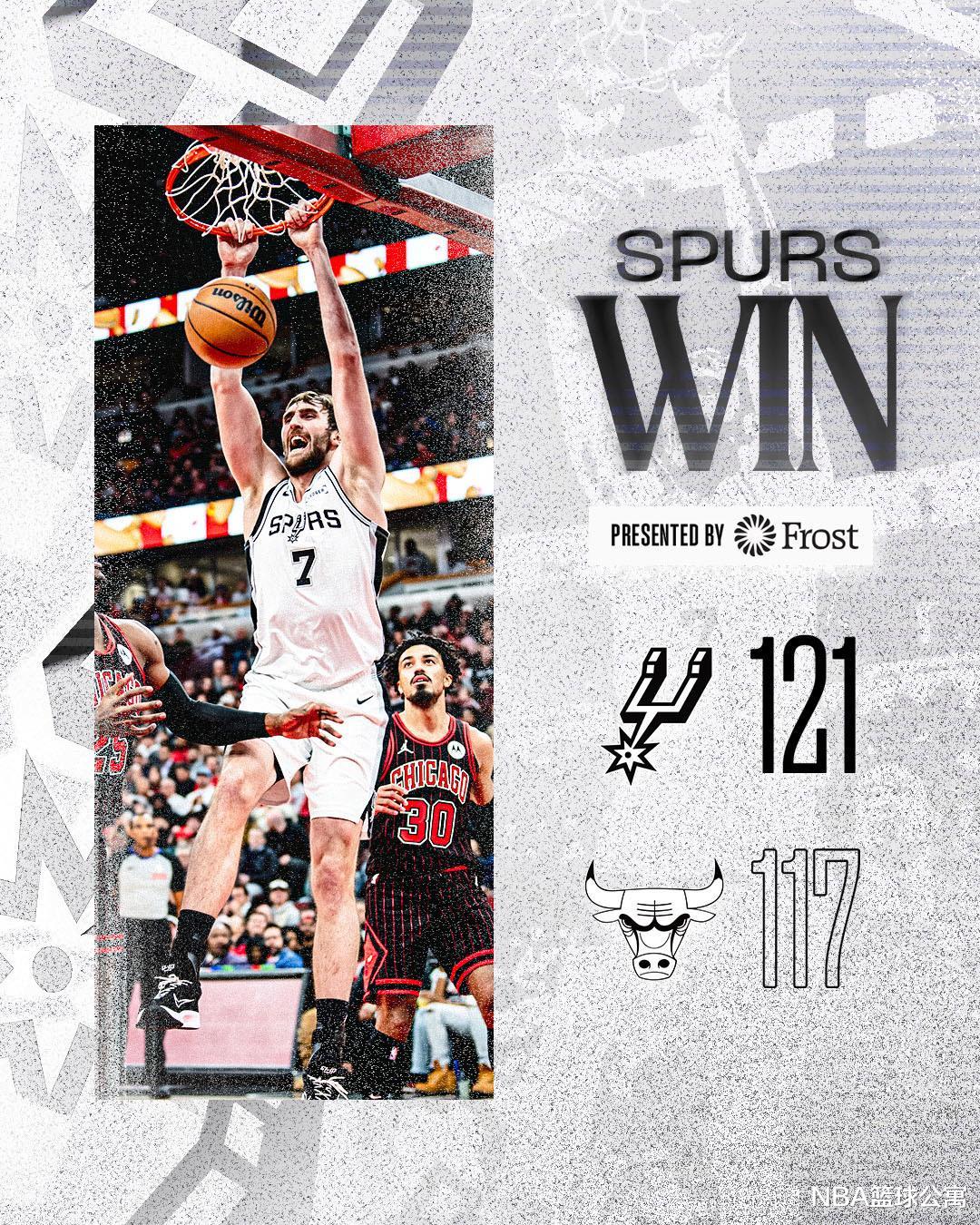 Huert hit the ball from the outside, Castle grabbed the rebound and was fouled, and then made 2 free throws. The Spurs led by 5 points to seal the victory. Huerter made 1 of 2 free throws, Wenbanyama made 2 of 2 free throws, Daosum scored a layup, and the game time ran out. In the end, the Spurs narrowly defeated the Bulls 121-117 and were able to stage a 13-point reversal. San Antonio has achieved 3 consecutive victories and continues to rank second in the Western Conference.