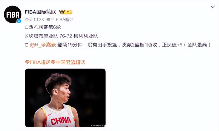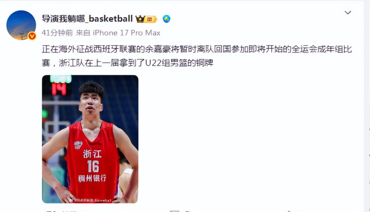 Now, according to a report from media director Where I Lie_basketball: "Yu Jiahao, who is playing in the Spanish League overseas, will temporarily leave the team and return to China to participate in the upcoming National Games adult competition. The Zhejiang team won the bronze medal in the U22 men's basketball team in the last session."