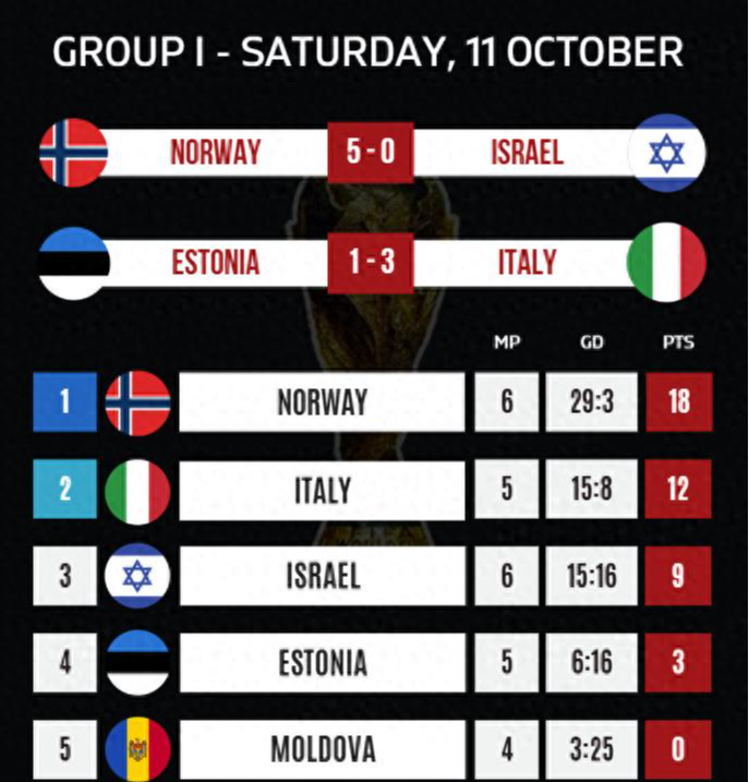 With a perfect record of six consecutive victories, the Norwegian team has completely grasped the initiative to qualify in Group I. After beating Israel 5-0, they topped the list with 18 points, and their goal difference soared to a terrifying number of 26. What's even more fatal is that Norway's opponent in the next round is Estonia, ranked 129th in the world, and there is almost no suspense in winning this victory. As long as it defeats Estonia, Norway's points will reach 21 points. Even if Italy wins the remaining three games and catches up to 21 points, the 19 goal difference is enough to completely eliminate the Azzurri.
