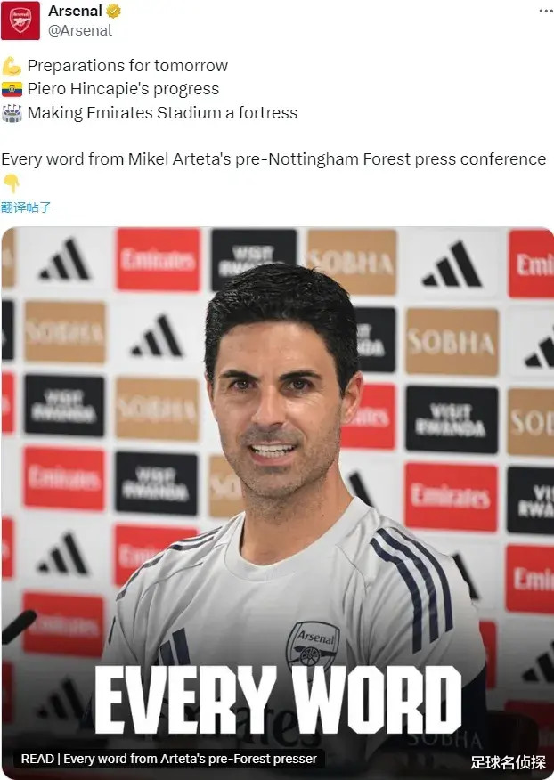 Injury, the good news is that Saliba has resumed training, at least 1-2 weeks ahead of the team's so-called "3-4 weeks", but Arteta is not 100% sure whether he will play.