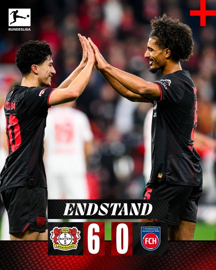 In the 10th round of the Bundesliga on November 9, Bayer Leverkusen defeated Heidenheim 6-0 at home, rising to fourth in the standings.