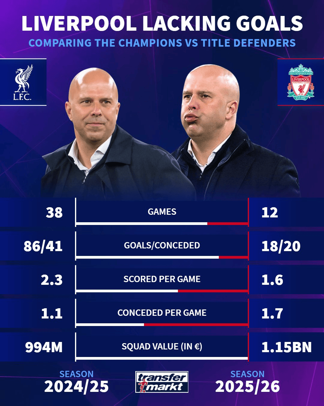 Data show that in the 2024/25 season, the team scored 86 goals and conceded 41 goals in 38 league games, averaging 2.3 goals and conceding 1.1 goals per game. So far this season, Liverpool has only scored 18 goals and conceded 20 goals, with the average goals per game dropping to 1.6 and the average conceding per game rising to 1.7.