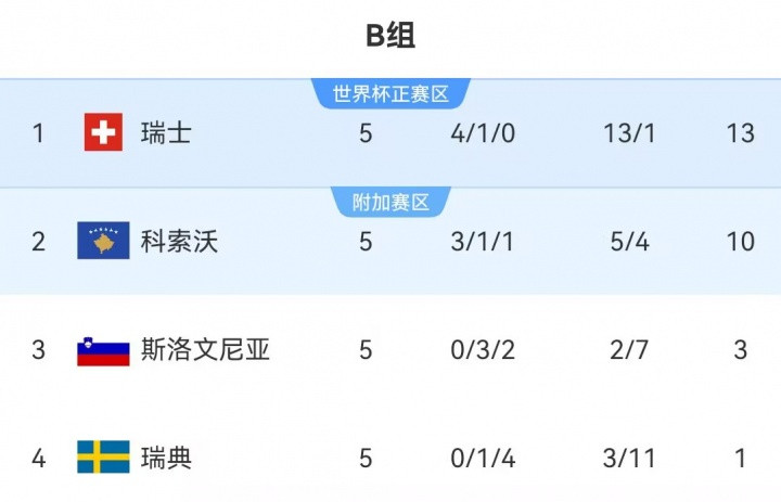 The situation in the standings of this group is similar to that of Group E: Switzerland leads Kosovo by 3 points + 11 goal difference, ranking first in the group; in the final round of direct dialogue between the two sides, Switzerland can also ensure promotion and go straight to the 2026 US-Canada-Mexico World Cup as long as it avoids a big loss.