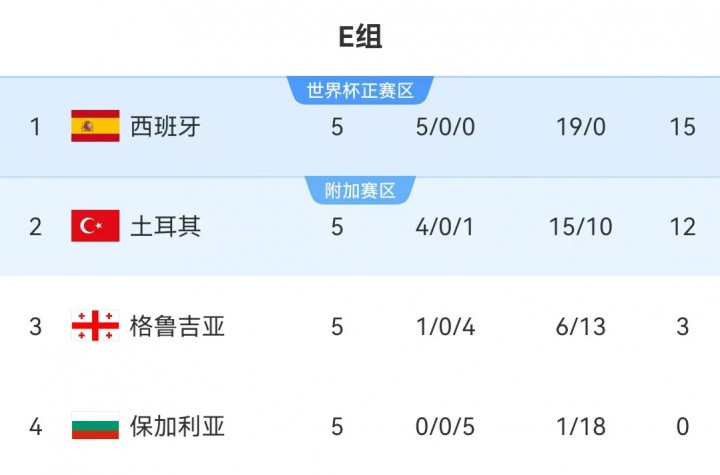 FootballOn November 16, in the fifth round of European Group E of the World Cup preliminaries, Spain 4-0 Georgia and Türkiye 2-0 Bulgaria. The latest standings of this group: Spain leads Türkiye by 3 points + 14 goal difference, still ranking first in the g...