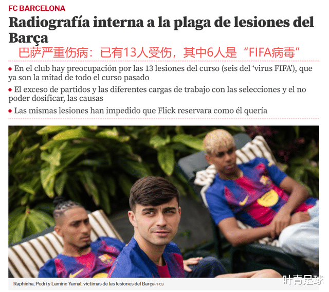 The "FIFA virus" is the reason for Barcelona's constant injuries. According to statistics from "World Sports News", 6 players including Yamal, Olmo, De Jong, Lewandowski, Ferran Torres, and Ter Stegen were injured while in the national team. This is also an important reason why Barcelona is dissatisfied with the Spanish Football Association and the Dutch Football Association: knowing clearly that the players are tired and injured, they force them to play, which aggravates the injuries.
