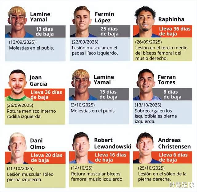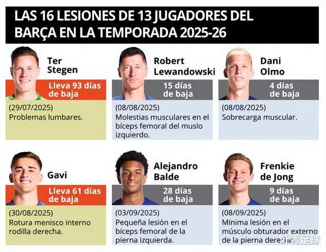 Ter Stegen has been out for 93 days; in August, Lewandowski was injured and rested for 15 days and Olmo was out for a week; at the end of August, Garvey was out for 2 months. Entering September, Barcelona's injury wave became even more serious. Six people including Balde, De Jong, Yamal, Fermin, Rafinha and Joan Garcia were injured!