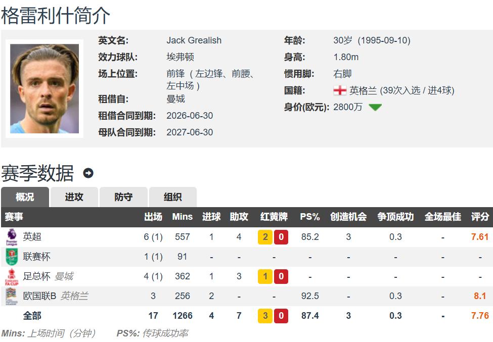 Grealish, who is thirty years old, joined Everton on loan this season and played in all 7 Premier League games, including 6 starts, contributing 1 goal and 4 assists, and directly participated in 5 goals. It is really amazingly efficient.