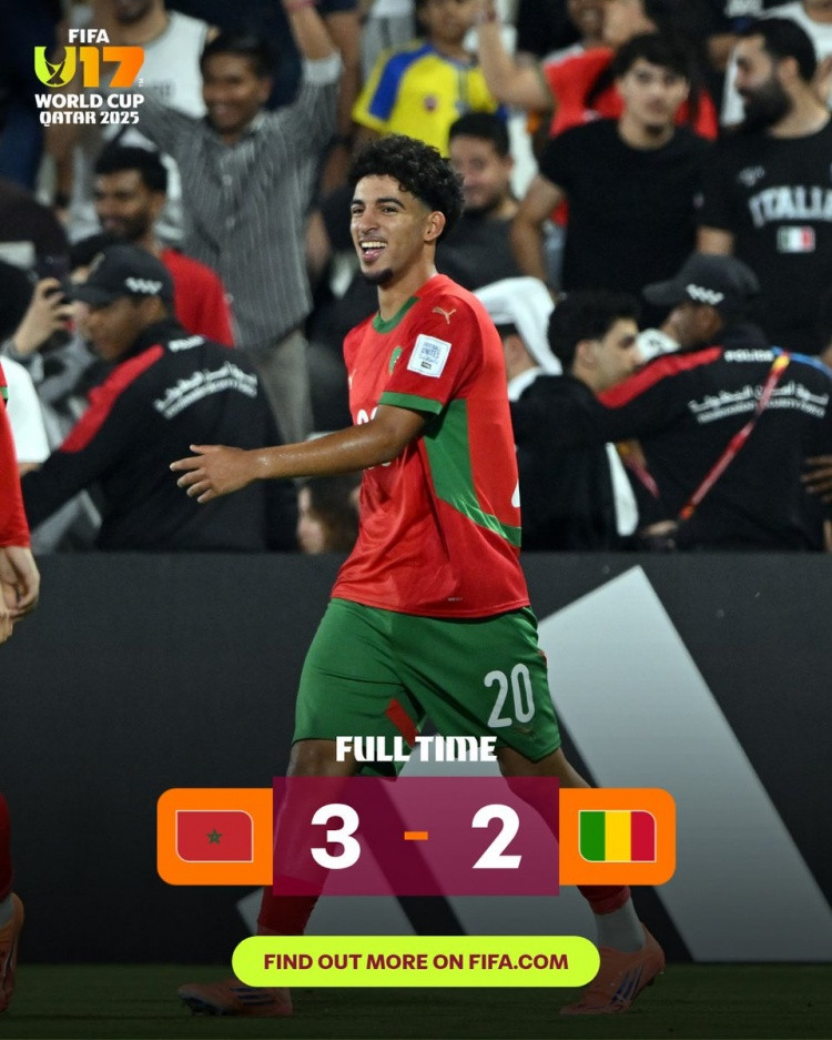 Addy Dports > Football > Morocco defeated Mali 3-2 in the 1/8 finals of the U17 World Cup and will face Brazil in the quarter-finals