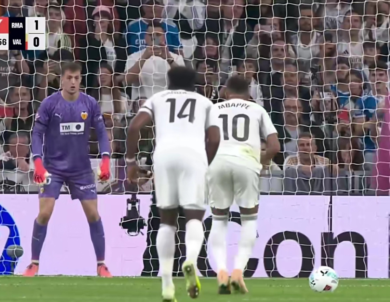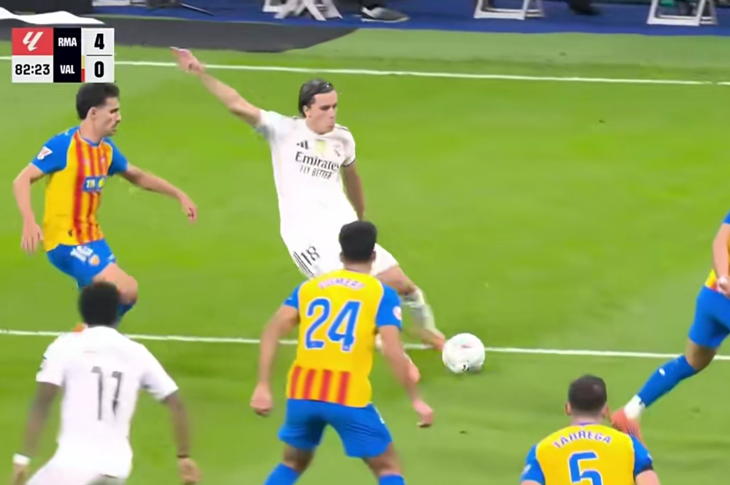Returning from the short intermission, Real Madrid still controlled the situation on the court. In the second half, A Fee scored the first goal of his Real Madrid career with a ground-breaking kick, locking the score at 4:0. In the end, neither team was able to change the score again. Real Madrid defeated Valencia 4-0, winning six consecutive games in all competitions and leading the standings with 7 points.