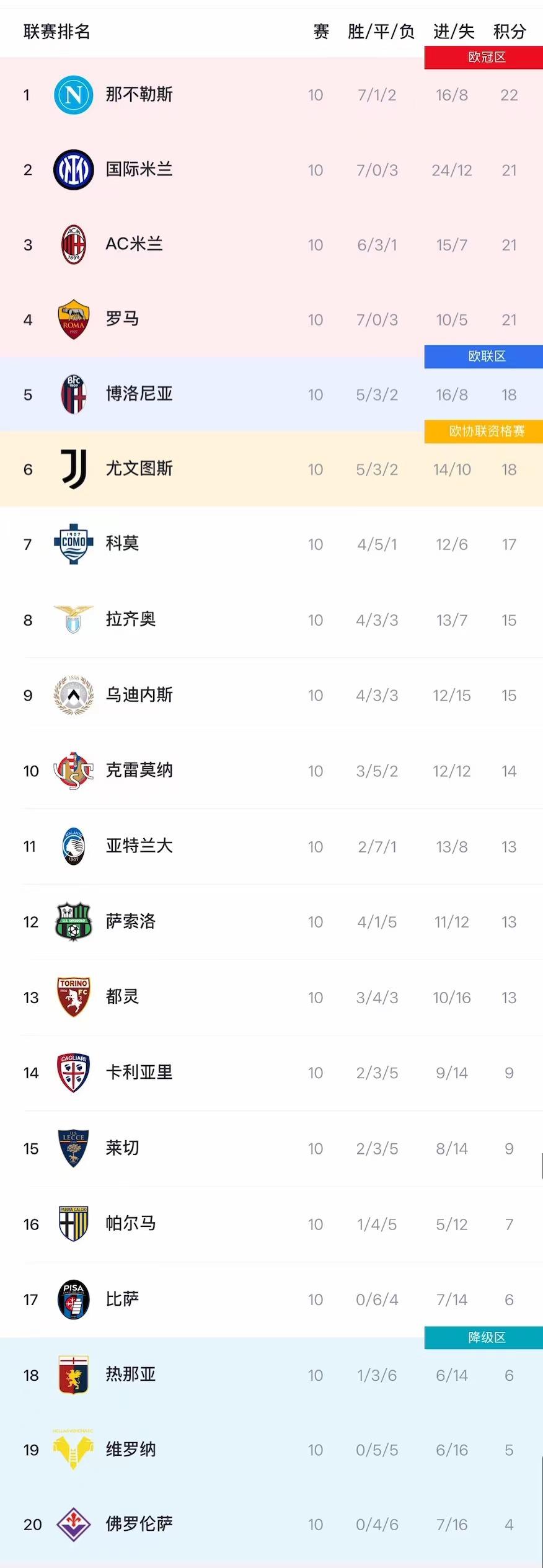 虎扑11月04日讯意甲第10轮全部场次结束,最新积分榜显示,那不勒斯、国米、米兰和罗马排名前四,但四队差距仅1分。 In addition, the four teams ranked at the bottom have only one win after 10 rounds.