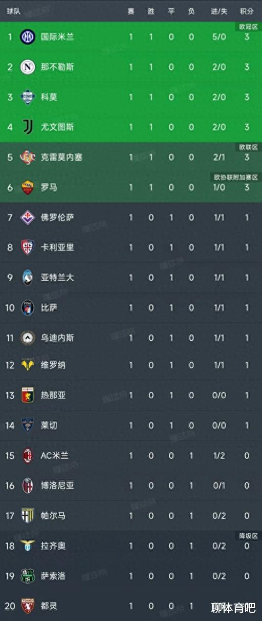 6 teams got a good start, all of which scored three points, namely Inter Milan, Naples, Como, Juventus, Cremonese and Roma. Last season's runner-up Inter Milan opened fire at home and defeated Turin 5-0. Bastoni and Lautaro made a pass and shot. Tulam made a double hit. New aid Boni scored his first goal to join the team. 5-0 was also the biggest score difference in the first round, and Inter Milan temporarily ranked first.