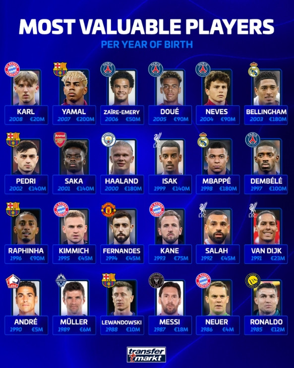 On October 27, Xunde Zhuan compiled statistics on the most valuable players of each age group. Among them, Messi, Cristiano Ronaldo, Haaland, Mbappe and others were listed.